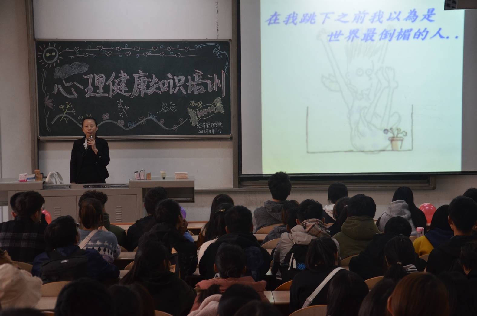 為引導(dǎo)我院學(xué)生關(guān)注自身心理健康及成長,經(jīng)濟管理學(xué)院于2019年11月19日在教2-110開展此次心理健康知識培訓(xùn)。本次培訓(xùn)老師為學(xué)生心理發(fā)展中心林曉萍老師,蒞臨現(xiàn)場的嘉賓有團委書記許金鑫老師、19級輔導(dǎo)員邵欣老師以及學(xué)生會主席劉倍含,共計一百五十多名同學(xué)參與此次活動。