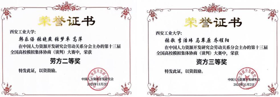 第十三屆全國高校模擬集體協(xié)商(談判)大賽由中國人力資源開發(fā)研究會(huì)勞動(dòng)關(guān)系分會(huì)主辦,北京物資學(xué)院商學(xué)院承辦。大賽基于理論聯(lián)系實(shí)際及多學(xué)科交叉融合的教學(xué)理念,搭建校際人才培養(yǎng)機(jī)制與模式交流的平臺(tái)。我校參賽隊(duì)伍獲國家級(jí)勞方二等獎(jiǎng)、資方三等獎(jiǎng),并且有三名學(xué)生獲得優(yōu)秀談判員一等獎(jiǎng)。